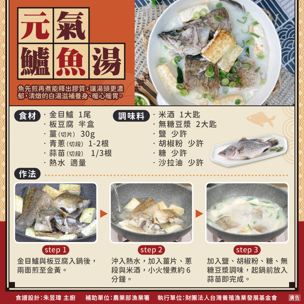 漁業署指出,天氣轉涼後,鍋物已成為民眾餐桌上最受歡迎的選擇之一,除了常見的雞豬牛肉鍋外,使用國產鮮魚入鍋更是美味熱門的吃法。不論是涮著魚片吃鮮味,或是切塊熬煮品鮮湯,均能展現多樣化的料理風貌,為餐桌增添豐富選擇。此次特別邀請六福旅遊集團朱昱瑋廚藝總監分享兩道適合秋冬滋補養生的魚湯料理—「元氣鱸魚湯」與「韓式辣魚湯」,展現國產魚入湯的好味道。前者把鱸魚煎至半熟後加入熱水,湯頭會快速變乳白色,再加入豆腐、蔥薑和無糖豆漿,增添湯品的醇厚溫潤,魚肉軟嫩,暖胃又回甘,是追求清爽甘醇風味的好選擇;而後者韓式辣魚湯則是由龍虎斑與韓式辣醬、辣粉、時令蔬菜一同燉煮,湯頭香辣不膩、魚肉Q彈帶膠質,加點魚板、菇類或蔬菜,層次更豐富,讓人一吃就上癮。