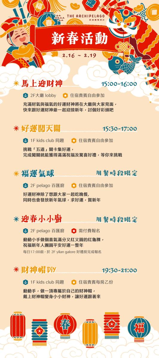凱渡酒店擁有海水泳池、溫泉俱樂部及Kids Club等多元化休閒設施,旨在提供全齡化的放鬆體驗。春節期間,特別於115年2月16日至19日推出「新春嘉年華」限定活動,內容涵蓋「好運闖天關」、「福運氣球」、「迎春小小廚」及「財神帽DIY」等互動體驗,結合節慶活動、親子同樂體驗與年節美饌,讓團圓時光在歡笑與祝福中展開,為新的一年開啟美好序章。在凱渡,一切假期所需應有盡有,只需卸下行李,即可搭上這艘「不必出航」的豪華郵輪,展開專屬於您的陸上郵輪假期。
