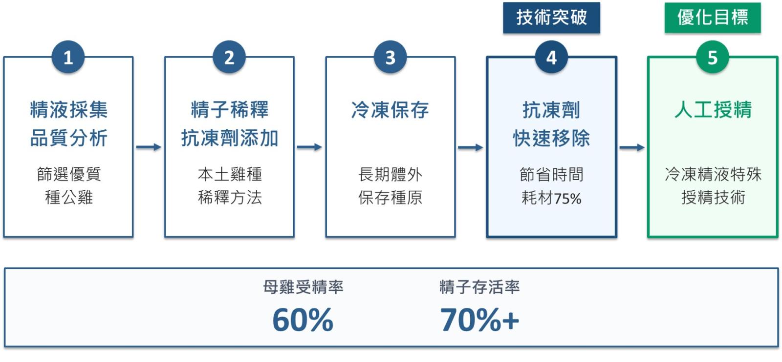 家禽種原保存對推動種禽產業遺傳改良及防範疫病風險至關重要,冷凍精液技術可長期體外保存種原且不受飼養空間限制,然而雞冷凍精液的繁殖效率仍低於其他家畜物種。農業部畜產試驗所針對此一瓶頸,從精液凍存、解凍至人工授精等各階段進行系統性優化,透過研究解凍後的精子存活率平均達70%以上,有效改善母雞受精率且操作成本節省 75%,顯著提升雞精液凍存實用效率。 畜試所黃振芳所長指出,冷凍精液技術環節緊湊,從精液採集品質分析、精子稀釋與抗凍劑添加、解凍後抗凍劑移除及配套人工授精技術等,每一步驟都攸關受精成功率。此次研究團隊將雞冷凍精液技術建立標準化程序,不僅可精準篩選優質種公雞,並成功解密適合本土雞種的精子稀釋方法。值得關注的是研究人員開發的創新抗凍劑快速移除技術,相較於傳統操作方法,可節省75%的時間與耗材成本,大幅提升產業實用化效率。透過技術整合優化,目前以冷凍精液進行單次授精,母雞受精率可達60%,為家禽冷凍精液應用效率之提升樹立重要里程碑。 畜試所進一步表示,雖然雞冷凍精液解凍後精子存活率平均達70%以上,但是母雞個體間的受精率仍存在差異,顯示除公雞精液品質與凍存技術外,母雞生殖道功能性分子表現與解剖構造差異也是關鍵因素。該所未來將持續整合公、母雞的生殖生理特性,優化人工授精操作程序,例如使用高精度正位移式移液器等,為家禽種原保存提供更完善的技術後盾。